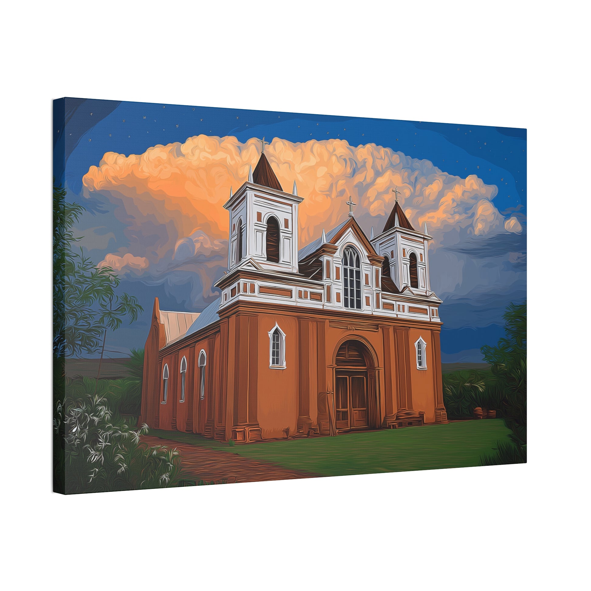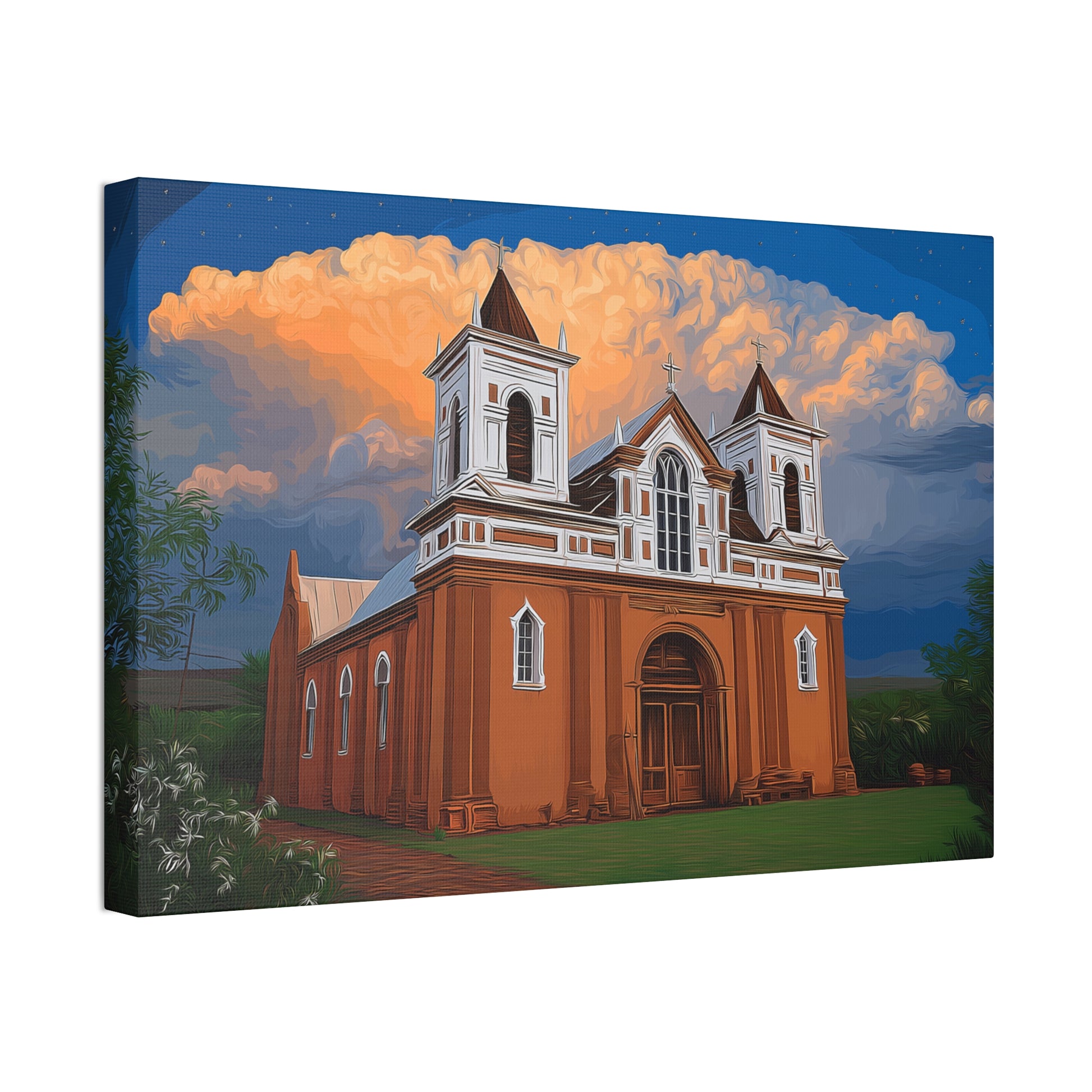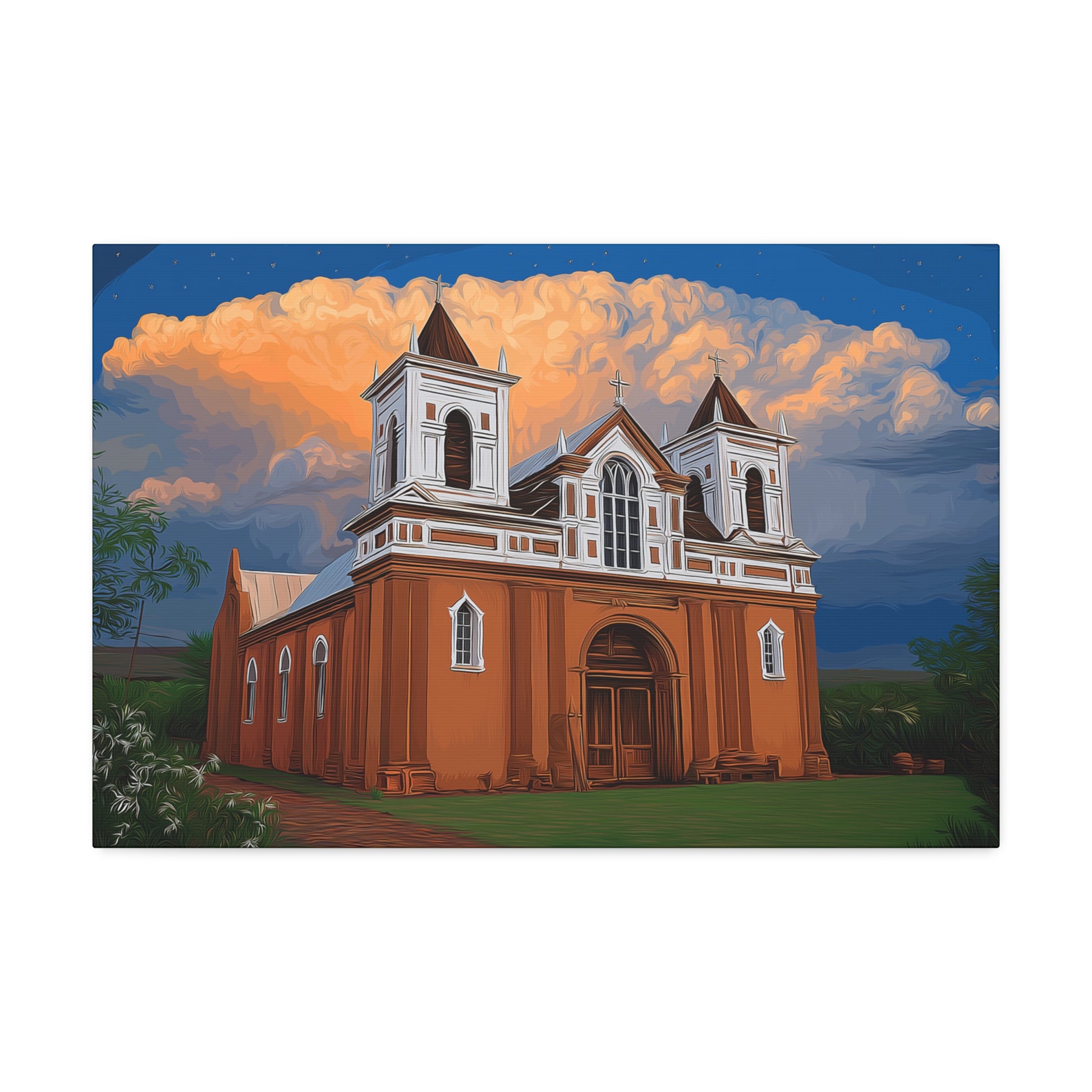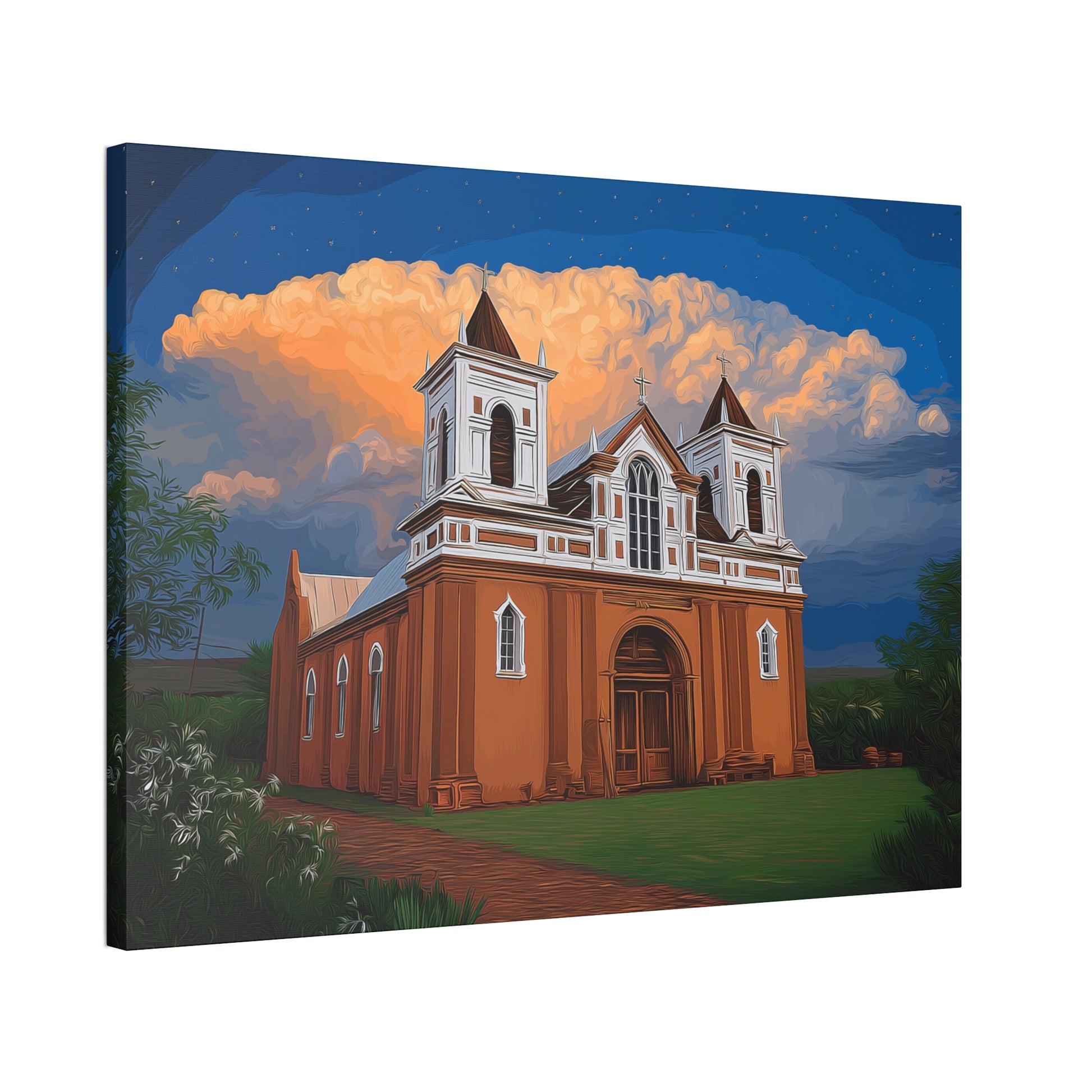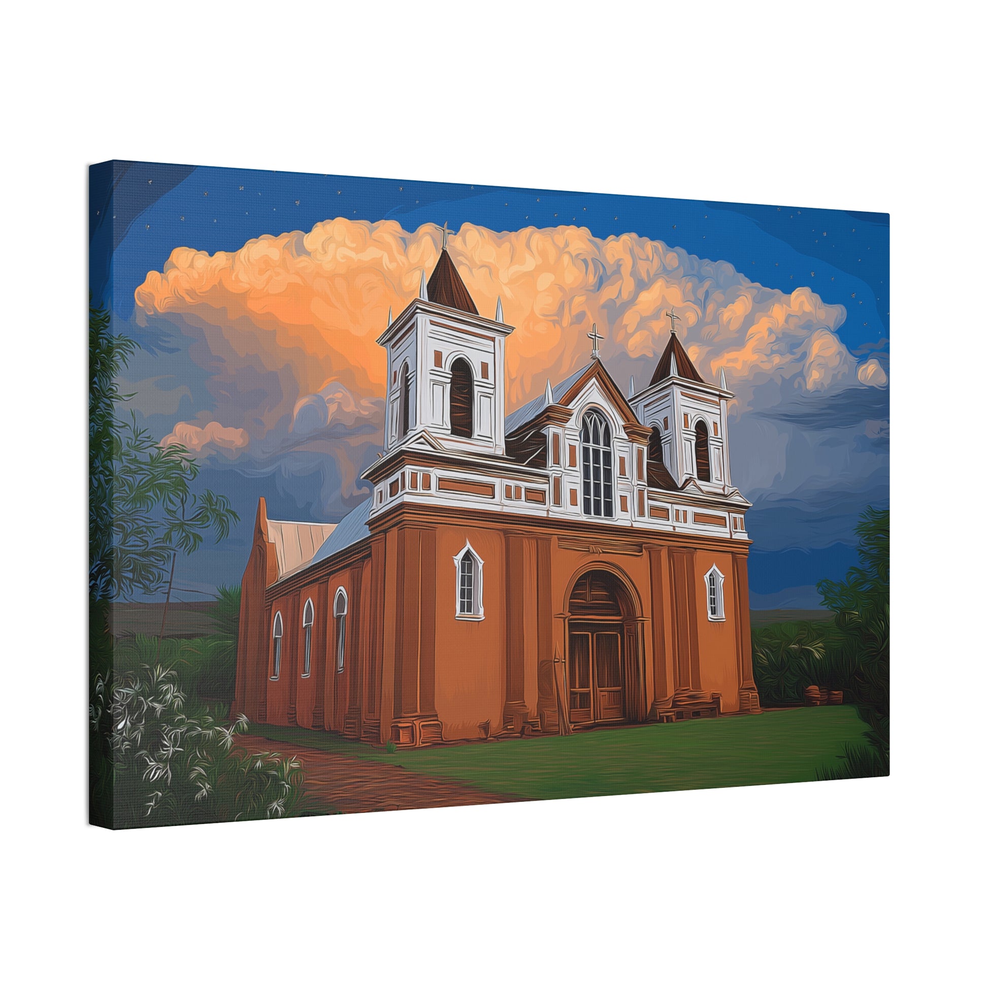 Elevate your space with this stately canvas art featuring a church with clouds, adding a touch of sophistication and tranquility to any room. Perfect for art enthusiasts, home decorators, and those looking to add a peaceful ambiance to their living spaces. Ideal for holidays, special occasions, and religious celebrations.