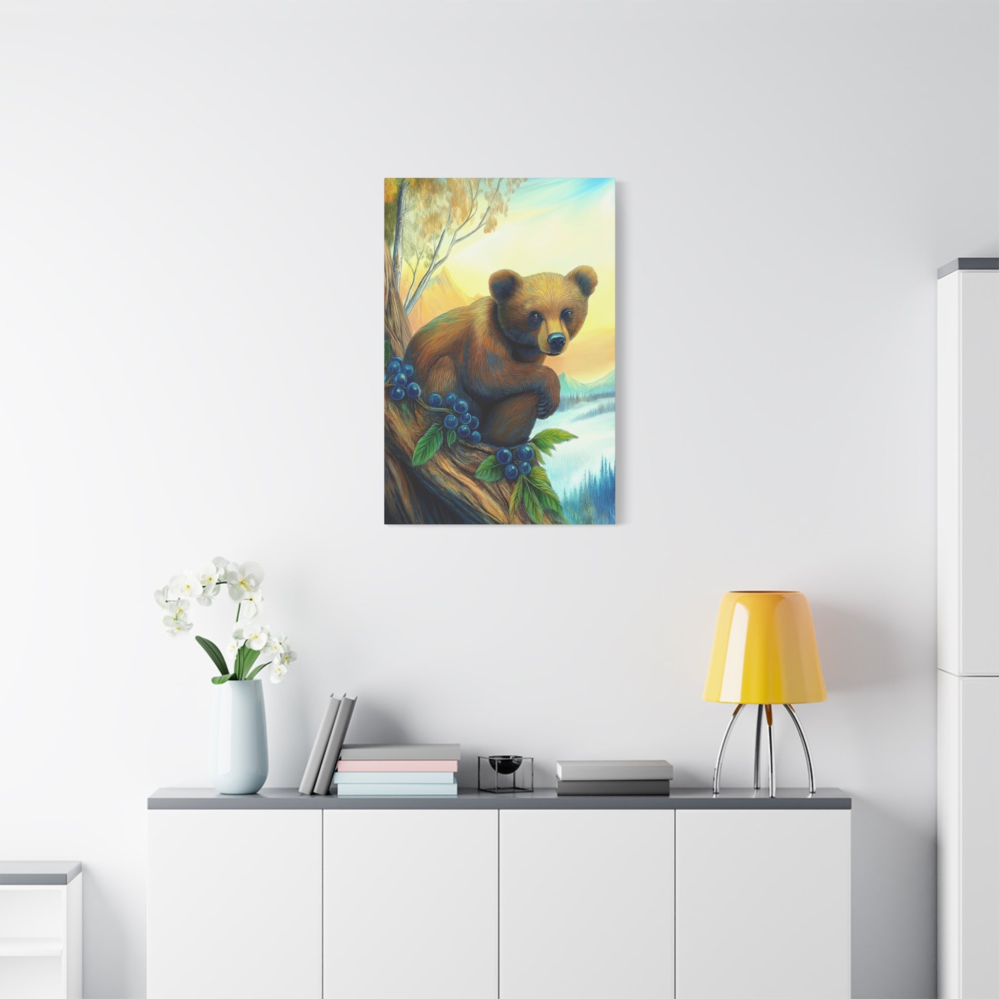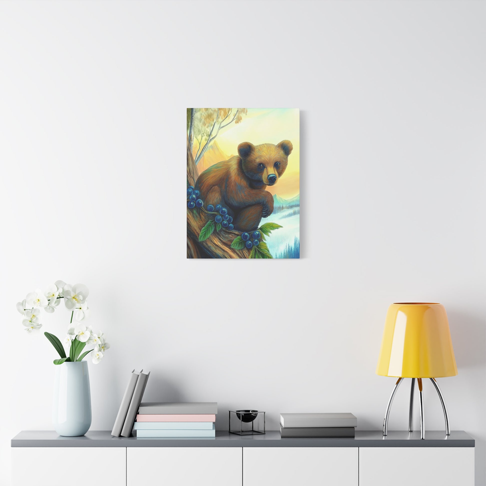 Bear Cub Watching design on a matte canvas, stretched and 1.25" thick. This canvas print gives a cozy and natural vibe, perfect for nature lovers and wildlife enthusiasts. Ideal for decorating living rooms, bedrooms, or cabins. Relevant for nature-themed home decor, gifting for animal lovers, and nursery decoration.
